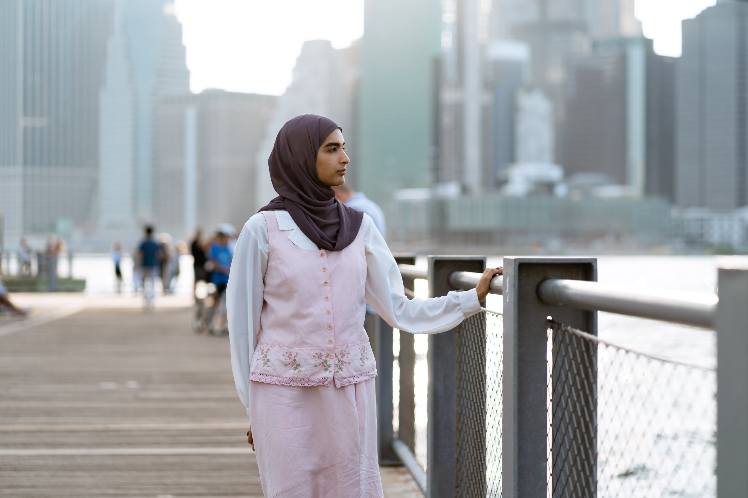 A woman with medium-dark skin and dreadlocks smiling and looking slightly upward, wearing a light-colored coat, standing in front of a red brick wall.